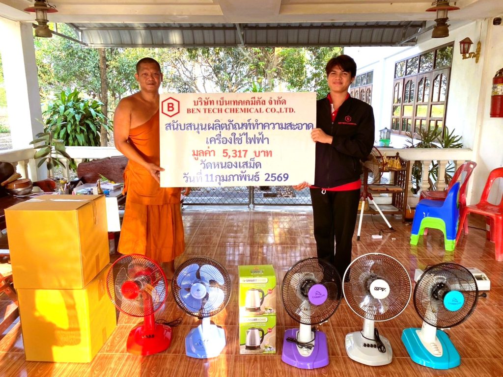 On February 11, 2026, Ben Tech Chemical Co., Ltd. supported the Raising the Gable Finial at Wat Nong Samet, Bo Kwang Thong Subdistrict, Bo Thong District, Chonburi Province, by donating cleaning products and electrical appliances for use during the event.
